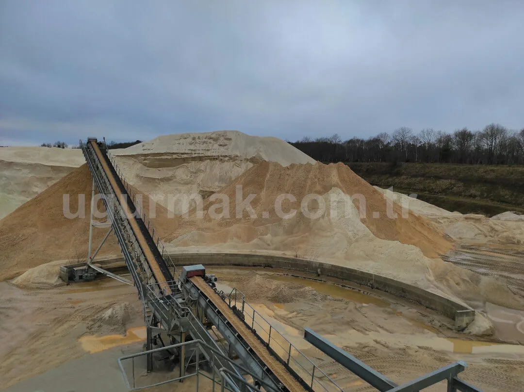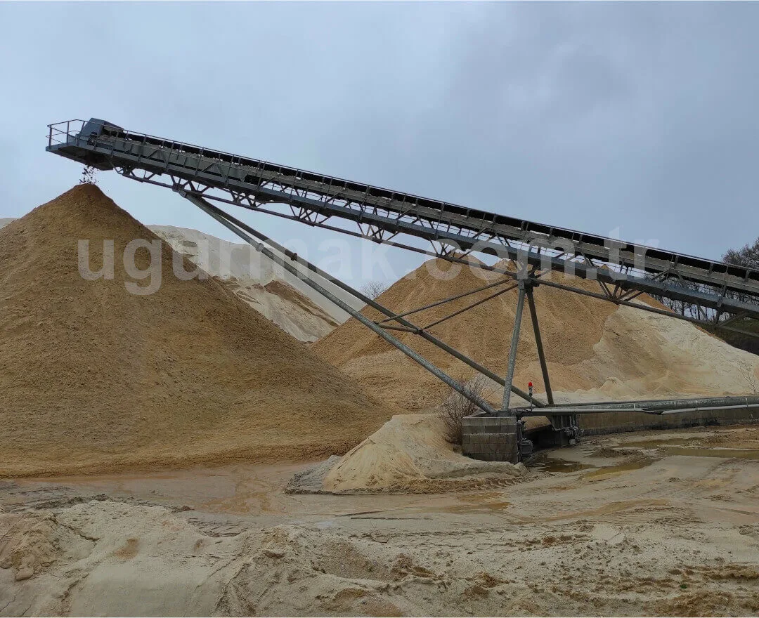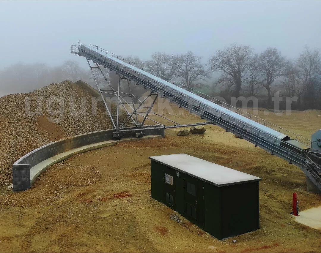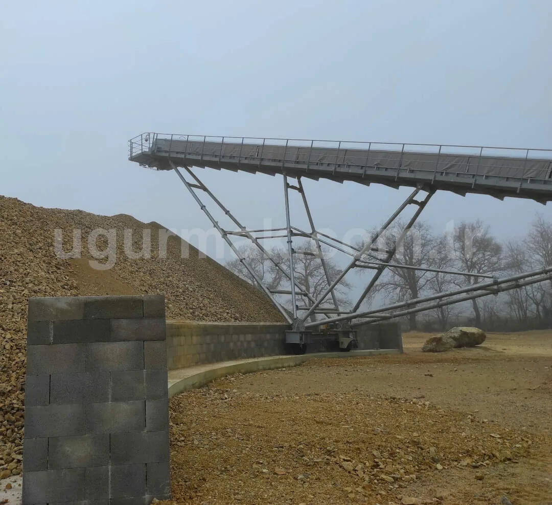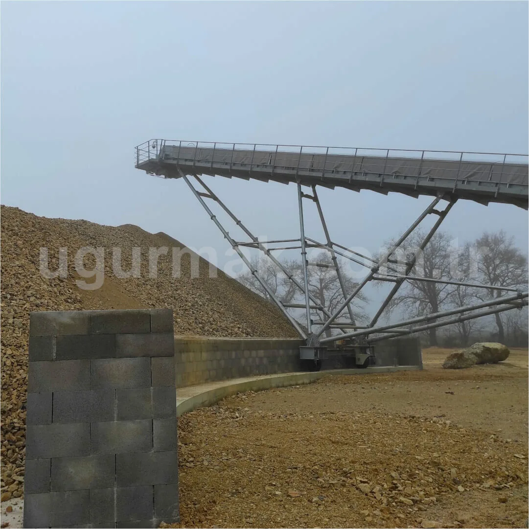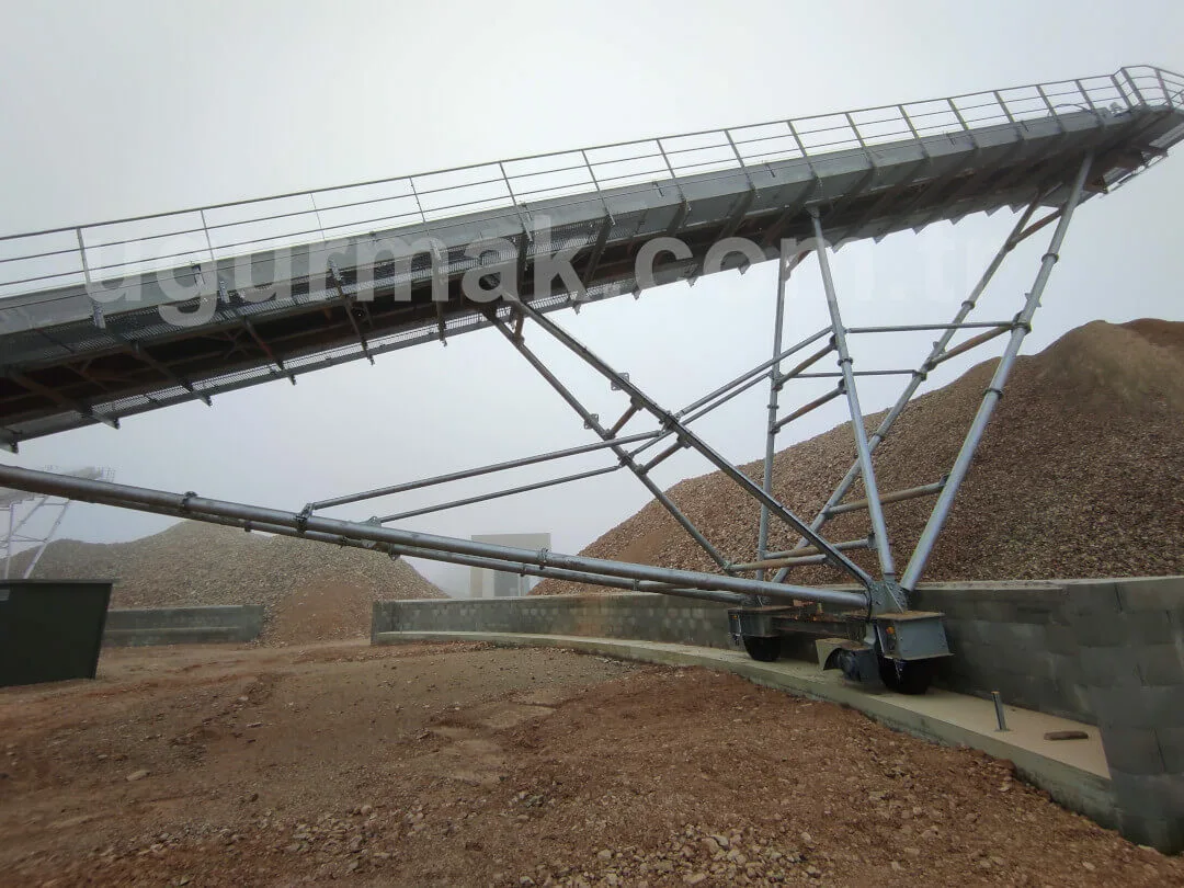 Stock conveyors can be produced as radial type according to the location of the facility, land conditions and customer demand. The Belt Conveyor chassis is connected to the ground from the tail module with a fixed joint. High-strength steel construction feet made to support the weight of the intermediate modules and the drive module are attached to the axle located on the wheels. These wheels are preferred as filled wheels in order to be loose-proof.